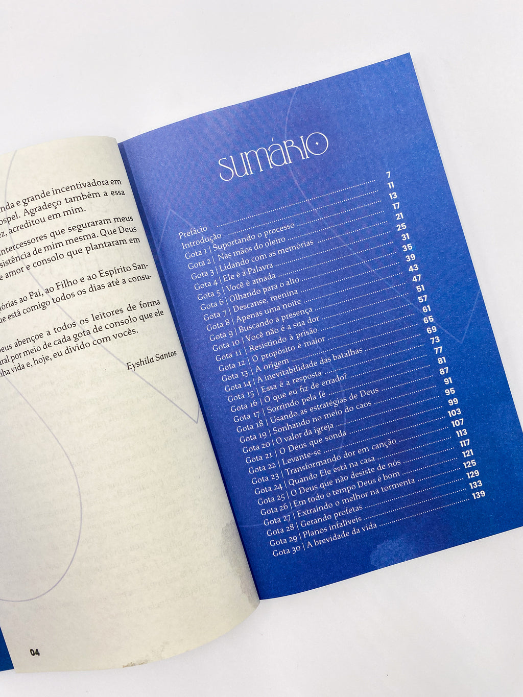 Com uma linguagem profunda e inspiradora, este devocional interativo traz 30 reflexões geradas nos momentos mais dolorosos da vida da autora, e cada mensagem é uma porção de sabedoria divina, destinada a nutrir e fortalecer a alma cansada. Textos bíblicos, orações e testemunhos de superação se entrelaçam, para mostrar que até mesmo nas noites mais escuras, ainda há vida. Além disso, você encontrará neste livro um espaço para, a cada dia, registrar sua própria jornada, produzindo suas gotas de consolo para o futuro; e ainda terá a oportunidade de, por meio de QR Codes diários, ouvir orações gravadas por Eyshila especialmente para esta obra.